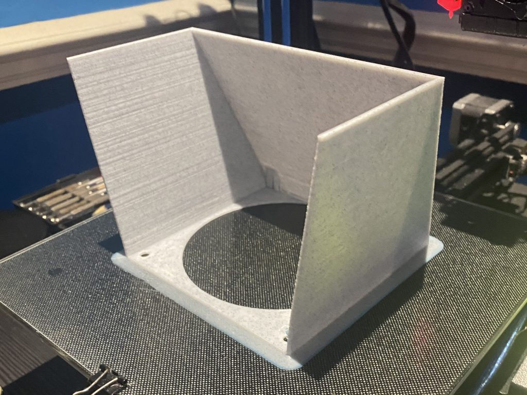one of the two halves of the diffuser after it had finished being 3d printed, this half took 10 hours to complete.